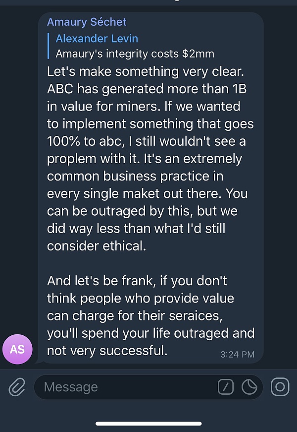 加密學術大咖、Blockstream CTO Greg Maxwell也被卷入爭論中。Amaury Sechet私信Greg Maxwell,直言“Bitcoin ABC已經給礦工帶來10億美元的收益,如果我們的新版本挖礦軟件讓礦工們把收入100%貢獻給ABC,也沒什么問題。在每個市場,這都是一個極端常見的商業實踐。你可能會生氣,但是這仍然是符合倫理的。”