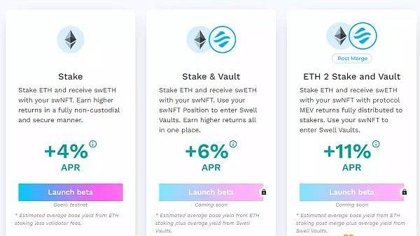 SwellNetwork是一種無需許可、非托管的ETH質押協議,專為質押者、節點運營商和以太坊生態系統構建。Swell于今年6月16日宣布與SSV達成合作,將優先整合ssv.network在分布式驗證器技術方面的進步,有助于更好地管理風險、提高驗證器性能。目前其Goerli測試網版本已經上線,TVL達到286ETH,年利率為4.2%。