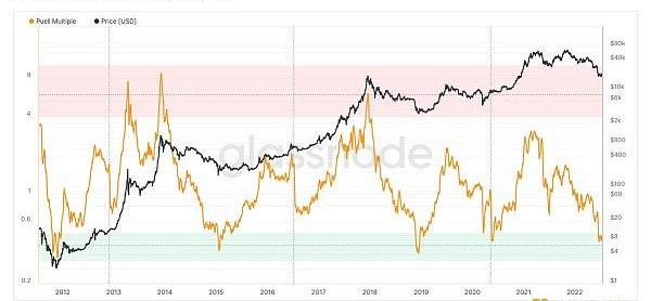 結束所有關于礦工的內容,讓我們看一些估值方法。第一個是termocap的市值。這比較了比特幣交易價格相對于礦工總安全支出的溢價;并且還針對不斷增長的供應進行了調整。