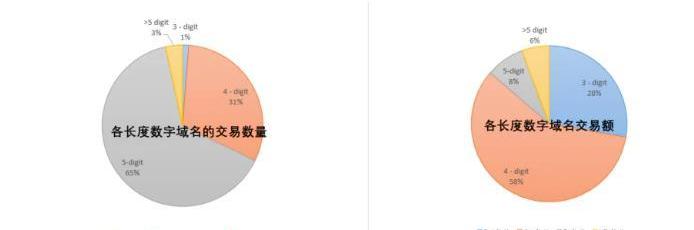 數字域名細分領域中,3位數字域名以1%的成交數量,貢獻了29%的交易額度。4位長度的數字域名不論是交易數量占比還是交易額度占比,都占據較大的比例。