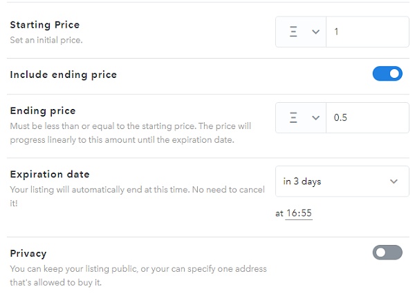 在 OpenSea 上,固定價格還包括一個遞減價格的模式:設定好上架期限和最終價格,這樣 NFT 上架之后,價格就會慢慢降低,直到期限結束時,價格降低到設定的最終價格——有點類似于清倉甩貨的感覺,似乎挺適合硅星人這種首次賣 NFT(極度缺乏自信)的人……
