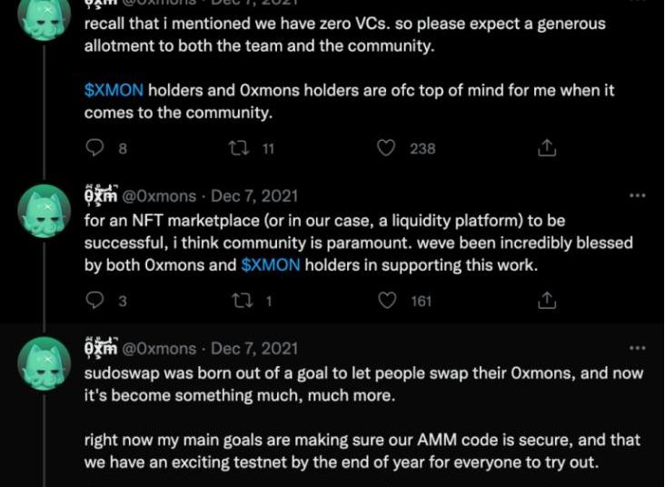 更發現其創辦人0xmons早于去年底表示Sudoswap要是有發幣計畫,0xmonsNFT及代幣XMON持有人將是首要目標。甚至在最初,Sudoswap僅是要用來讓用戶交易0xmonsNFT。
