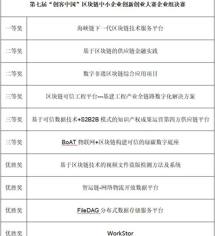 福建省創新研究院張云峰副院長、福建省企業與企業家聯合會劉捷明會長、福建省數字福建建設領導小組辦公室陳同彩副主任、中國電子技術標準化研究院研究室李鳴主任、中國計算機學會區塊鏈專委會斯雪明主任,海峽兩岸法學交流促進會副會長、北京培黎職業學院魏群總督學,福州市工業和信息化局林端雄副局長,福州高新技術產業開發區管理委員會林翔副主任,河北金融學院區塊鏈中心常務主任趙永新教授,福建省區塊鏈協會陳意斌會長等嘉賓和來自福州市、漳州市、三明市、龍巖市、寧德市等各地市工信局、平潭綜合試驗區經濟發展局、以及大賽各舉辦單位、承辦單位相關處室負責同志共同參加和見證了大賽頒獎典禮,至此,第七屆“創客中國”區塊鏈中小企業創新創業大賽圓滿收官。