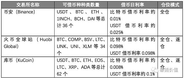 (碳鏈價值注:全倉則意味著所有杠桿賬戶內的資產,都可以用作抵押品。且在借貸某個幣種時,不需要有哪個幣種也可以借貸。在這種全倉模式下,杠桿幣種越多其實是更有優勢的。在逐倉模式下,各倉位的保證金與盈虧單獨核算,各倉位的風險與收益獨立,如果一個倉位爆倉,不對杠桿賬戶中其他倉位產生影響。另外,借幣利率只選取了BTC和USDT兩個主流幣做對比。)