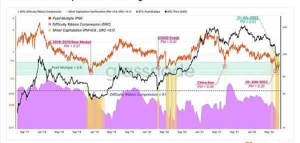 皮勒乘數跟蹤礦工的美元總收入,相對于1年平均值。在這里,我們可以看到目前比特幣礦工的收入僅為12個月平均水平的49%。這意味著礦工收入壓力是一個可能的因素。