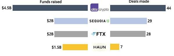 a16z成為2022年上半年投資最多的頂級VC,總計45億美元。他們共進行了44項投資,涵蓋DeFi、Web3、NFT和基礎設施等領域,但沒有CeFi公司。值得注意的投資項目包括Phantom、YugaLabs、NEARProtocol和Lido。