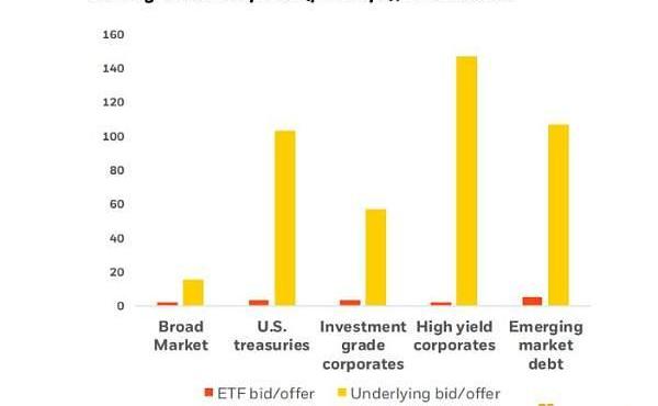 從第一份數據可看出,在2022年三月,ETF債券要比它的標的資產擁有更多的流動性。一些研究也表明,這種聚合投資減少了來自資產甩賣的影響。?