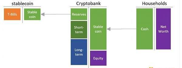 在規模上,這樣的系統可能對信貸中介不利。事實上,如果穩定幣成為新的銀行儲蓄,將使后者規模縮減,減少傳統銀行的信貸創造。這就是加密銀行發揮作用的地方。