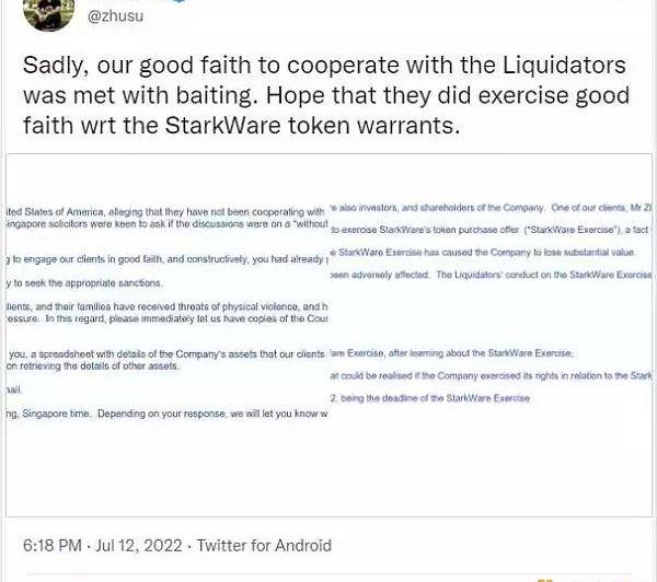 在7月8日提交給這起美國破產案的文件中,負責清算該基金的顧問表示,SuZhu和KyleDavies尚未與他們合作,且這兩位創始人也下落不明。針對這一指控,7月12日,SuZhu發推文表示,他們與清算人合作的「誠意」努力「遭到了誘導」(編者注:也即SuZhu表示清算人的指控是在誘導3AC的客戶/債權人)。SuZhu、KyleDavies以及他們的律師沒有回應置評請求。