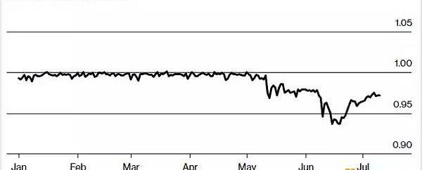 上圖:2022年以來,以ETH計價的stETH價格,圖源:Bloomberg