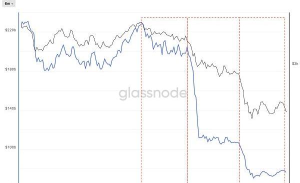 如果我們回過頭,回顧一下2022年4月至今的暴跌是如何發生的,大致可以把這段艱難歲月分為三個階段,見圖4,其中灰色是以太坊市值變化,藍色線是以太坊上TVL變化情況。