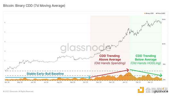 我們也可以在 CDD 指標中看到這種行為,該指標衡量幣交易量是大于、還是小于長期平均水平。這里我們應用了 7 天移動平均線,顯示過去三個月確實有低于平均水平的趨勢,表明 LTHs 正在持有更多,賣出更少。