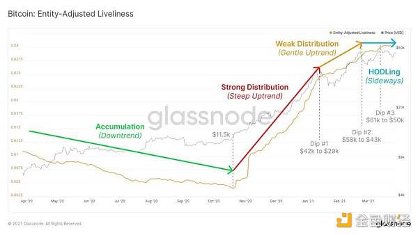 陡峭的上升趨勢(紅色)。賣出的天數明顯多于累積的天數。這意味著長期持有者正在大量賣出。