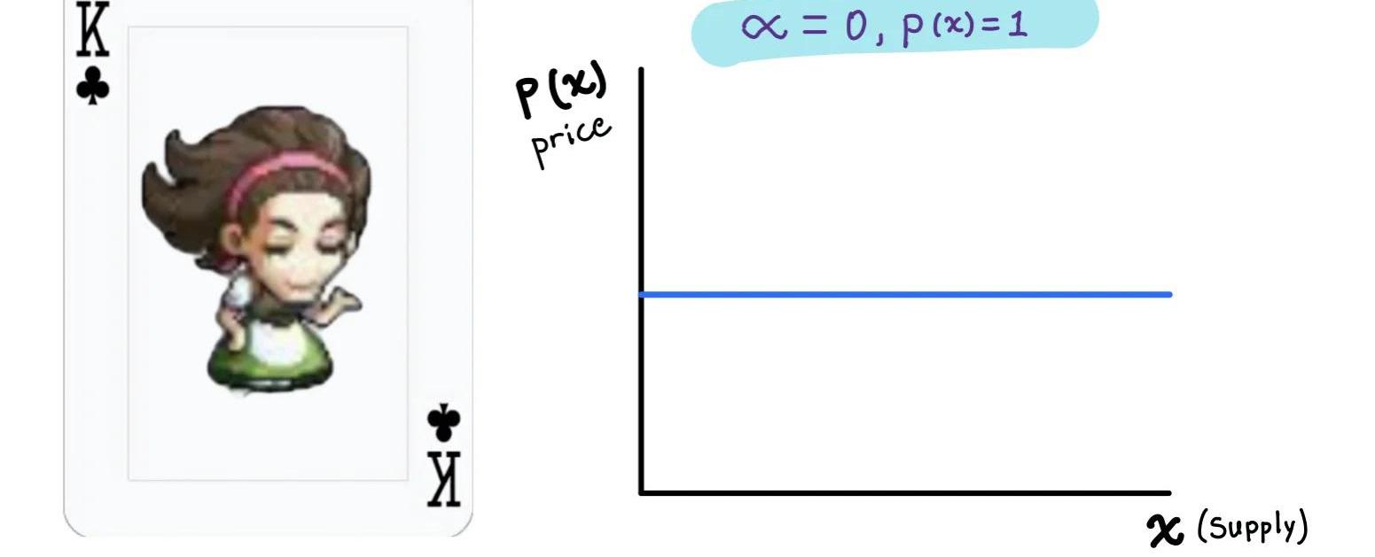 讓我們從常數曲線開始,其中a=0,簡化為p(x)=x^0=1。供應量呈平線。以此類推,恒定曲線就是我們的王道。根據神圣的權利,國王下令代幣的價格。她是絕對的,堅持她的法令。她的匯率是法律,無論供應如何增長或減少。
