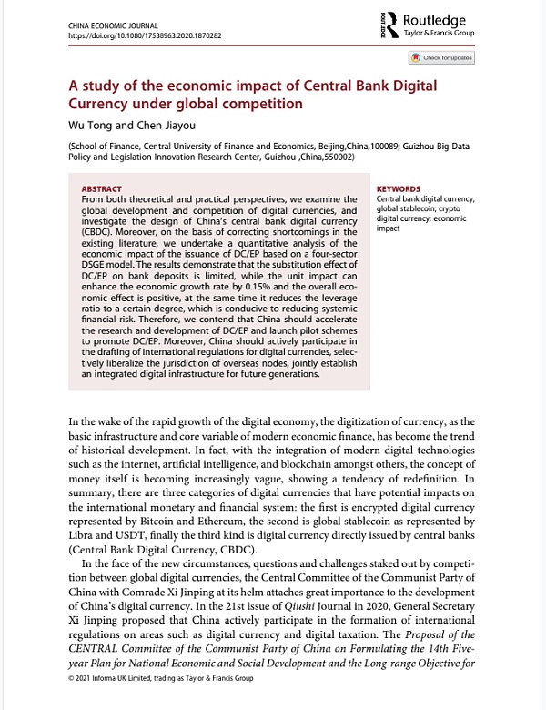 面對全球數字貨幣的競爭,中國已逐漸將數字貨幣提高到國家戰略水平。促進CBDC是一項系統的全球性項目。它應該服務于政策目標并防止潛在風險。鑒于全球數字貨幣的發展,本文從理論和實踐的角度考察了中國CBDC的機制。此外,在糾正現有文獻不足之處的基礎上,本文基于四部門DSGE模型對中國發行CBDC的經濟影響進行了定量分析。結果表明,CBDC替代銀行存款的影響是有限的,而單位影響可以使經濟增長率提高0.15%,總體經濟效果是積極的,同時降低了杠桿率比率在一定程度上有利于降低系統性金融風險。