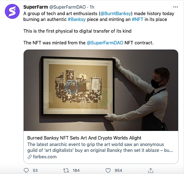 著名街頭藝術家 Banksy 作品 Mornos 被燒毀,將鑄造為 NFT 在 SuperFarm 拍賣
