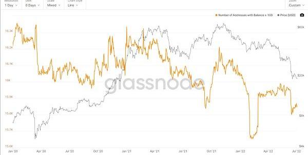 BTC地址數:持幣100以下的地址數進場依舊快速,持幣100以上的地址數小幅度下跌。