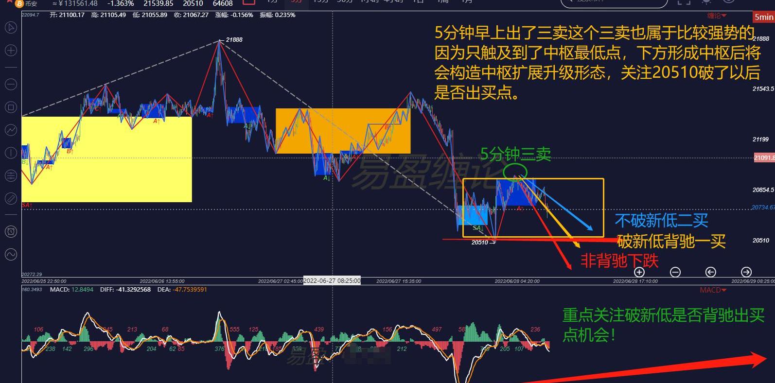 日內短線5分鐘圖看,三賣已經出現,當下再走5分鐘向下線段。注意圖中幾種走勢分類,特別注意再破20510后是否背馳走反向一段。日內最好機會為中樞第三段賣點機會。