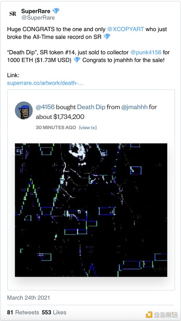 在SuperRare平臺的二級市場,著名加密藝術家XCOPY的《Death Drip》作品拍出了1000ETH的天價!創下該平臺目前的拍賣紀錄!