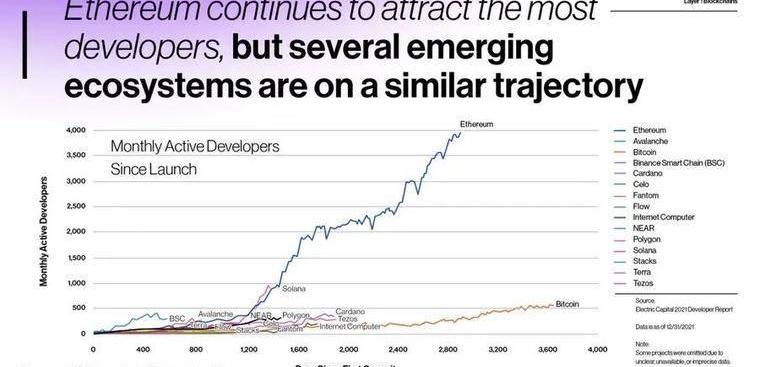 具體到賽道,首先說說Layer1,即公鏈。多鏈時代已經到來。ETH當然是一騎絕塵,不過其他各種新公鏈的增長也呈現了跟以太坊早期類似的曲線。從活躍地址數和日均交易量來看: