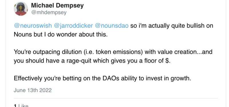Nouns通常依賴于人們傳播他們的品牌和敘述的能力,以便為DAO增加更多價值。雖然應該憤怒退場創造了一個類似于RFV動態的良好「底價」,但這忽略了熊市中的一個基本問題,即……人們將真正厭倦加密品牌一段時間。