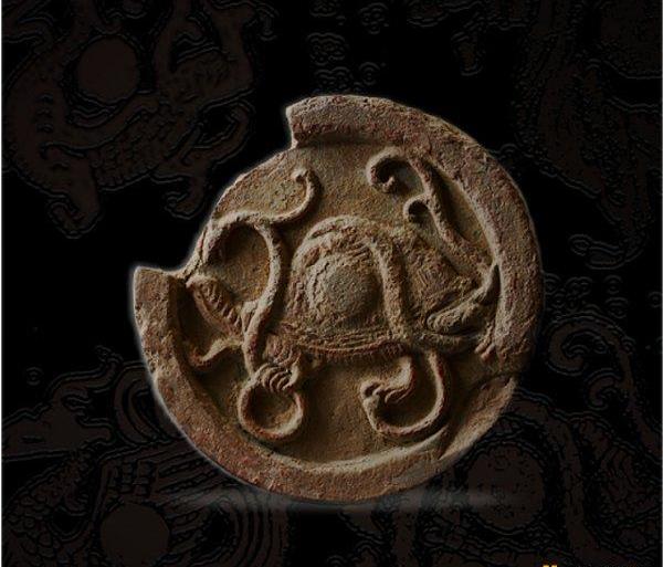 玄武紋瓦當,直徑19cm,當面一龜爬行,一蛇纏繞其身,蛇頭龜首相對,龜甲及蛇身上的花紋清晰,整個造型沉穩渾穆。玄武是我國古代神話中的北方之神。《楚辭·遠游》有“召玄武而奔屬”之句。《文選》注:“龜與蛇交曰玄武。?”由于人們認為北方屬水,玄武是北方之神,具有滅火的能力,因而玄武圖案也出現在倉廩、武庫等建筑物上。