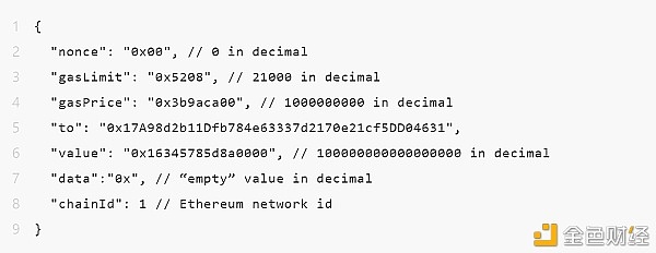 隨即跳出幾個值:nonce,gasLimit,gasPrice,data,和chainId。這與我們的交易內容沒關,而是與我們的交易執行方式有關。這是因為在以太坊中發送交易中,您必須定義一些其他參數來告訴礦工如何處理您的交易。我們交易中的兩個屬性涉及“ gas”,這是計算工作量的度量單位,必須將其支付給以太坊礦工才能將交易提交到區塊鏈網絡。