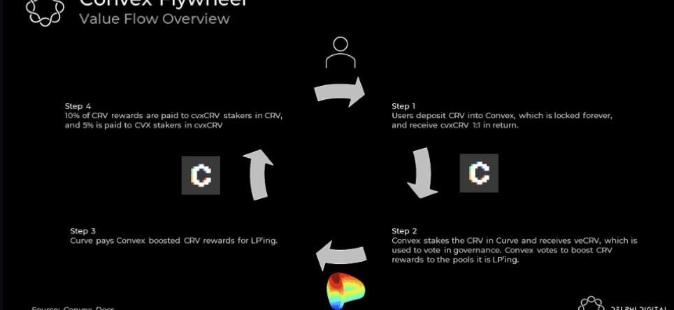 這就是反身性的作用:CVX價格越高,在Convex上質押CRV或CurveLP代幣的人的收益就越高。這個收益率越高,將存放在Convex上的CRV和LP代幣的份額就越高。
