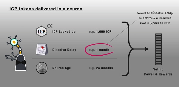 相應的,當用戶準備贖回代幣的時候,就需要溶解掉神經元,如上圖所示經過半個月到八年左右的延遲期之后,代幣會回到用戶手中,可以自由流通。