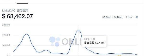 OKLinkLinksDAO專頁顯示,在庫里買入后,該項目的日均價和交易額都有了明顯的拉升,地板價已推高至0.72ETH,但名人效應僅持續2-3日,現地板價已降至0.62ETH,跌幅為14%。