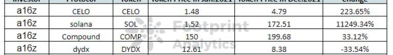 從上圖FootprintAnalytics的數據可以看到,a16z投資的DeFi項目的Token價格大部分有不錯的漲幅。跟隨投資風向,也是一個評估項目的捷徑。