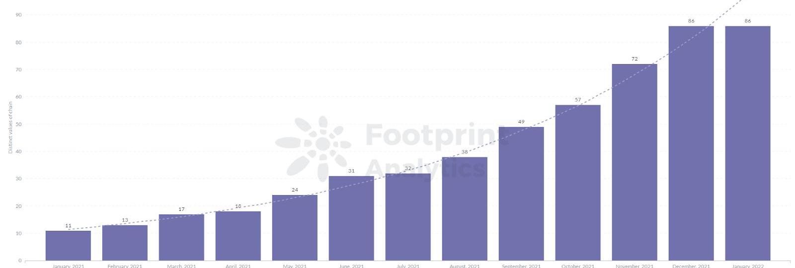 據FootprintAnalytics數據統計,目前累計已收錄的公鏈數量有86條,對比2021年初的11條,數量增長近7倍。