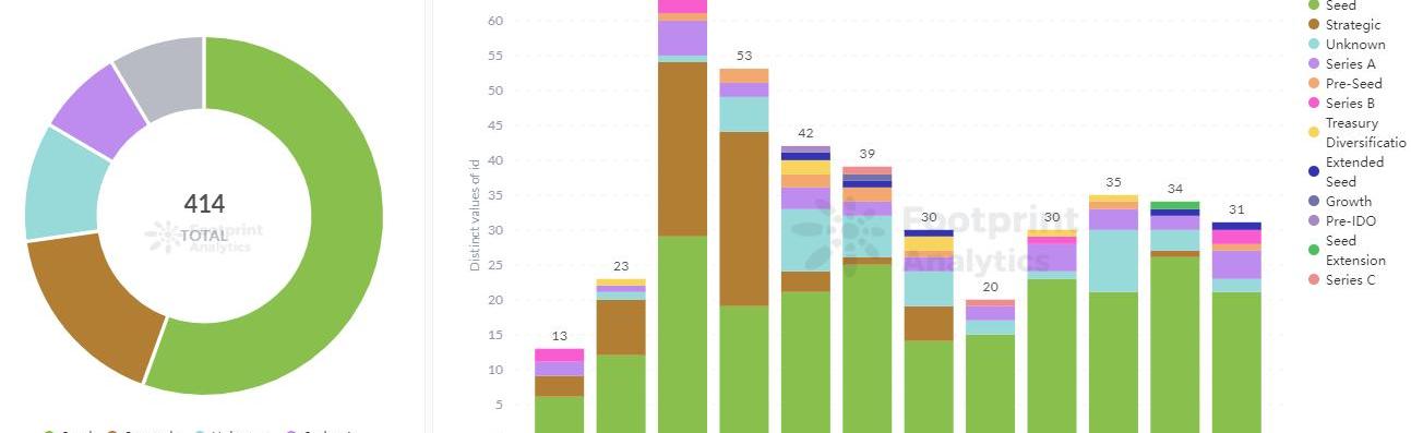 融資輪次上來看,依然是種子輪占主導,這與DeFi領域創新項目頻出,技術更新迭代速度快是分不開的。