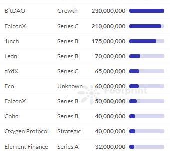 項目上來看,DeFi項目融資數額前三名為去中心化自治組織BitDAO、資產交易平臺FalconX以及去中心化聚合交易所1inch。