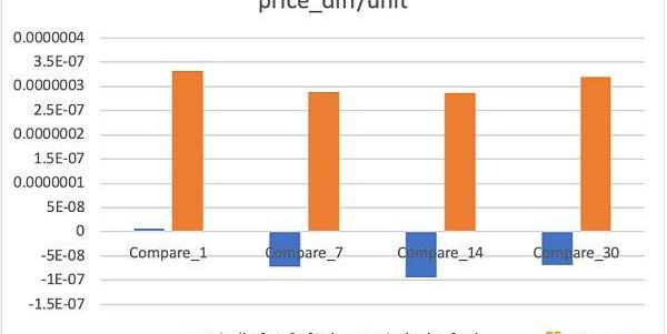 這里,為了方便我們統一把三天前的價格作為鑄幣前價格變化(”diff-3/3”),并與不同時間間隔?(X)?之后的價格進行比較得到“Compare_X”,公式為: