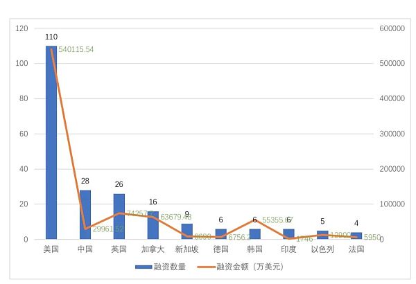 4、美國區塊鏈領域共計發生110筆融資,中國共發生28筆融資;融資金額上,美國為54.01億美元,中國為2.99億美元。