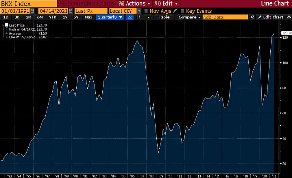 這是代表美國主要商業銀行的KBW銀行指數的最新圖表。正如你所看到的,在2007年達到頂峰之后,它最近才重新恢復到歷史高點。美聯儲已經采取了一切措施來拯救那些大到不能倒的銀行,而這些銀行仍然花了14年時間才恢復2007年的高點。