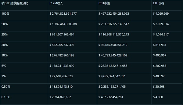 這些數字相當非同尋常,但由于這是對一個不確定未來的非常粗略、較高基準的背景分析,它不太可能完全準確。假設0.5%的交易數量被轉移到以太坊生態系統,ETH的價格將比目前水平升值10倍;假設轉移比例為0.1%,ETH價格將翻一番。