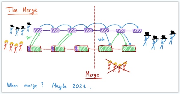 合并之后,信標鏈 (紫色) 是共識鏈,切換為 PoS 共識的 eth1 鏈 (紅色) 將作為執行鏈。什么時候實現合并?可能在2021年實現...