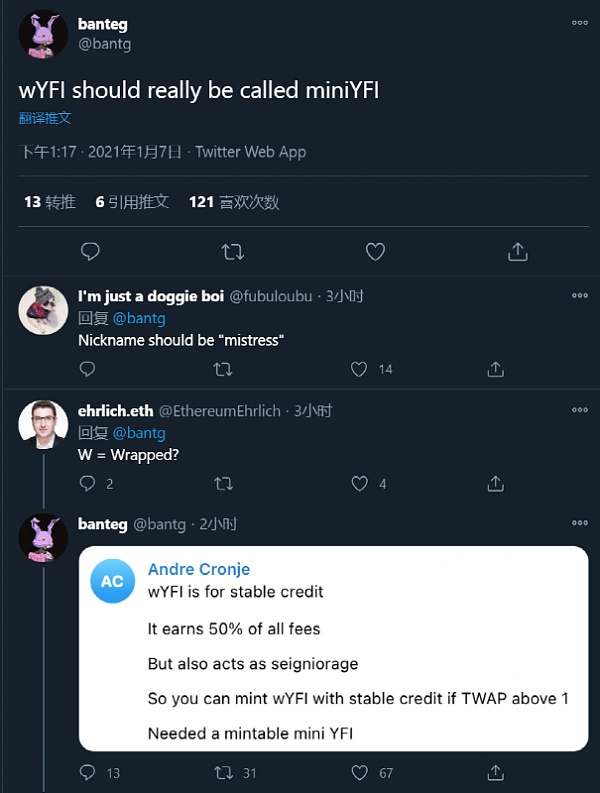 不僅如此,AC透露道,Stable Credit的產品還將為Sushiswap提供無償損失保護。在第二次迭代中,AC引入了免息協議貸款,而在第一次迭代中,所有Stable Credit都會被銷毀,這意味著存款者不能靠代幣獲得收益,而只能獲得與其鑄幣量掛鉤的相關價值。而以債務的概念代替50:50的比重,讓協議可以只銷毀債務,并讓抵押品提供者獲得所有利潤,包括交易費和代幣升值帶來的收益,進而補償無償損失。其中還包括了可能作為底層資產的wYFI,每一枚YFI可印鑄出1000枚wYFI并無法反向鑄造,被印鑄出的wYFI可享受Stable Credit協議中50%的費率分成。