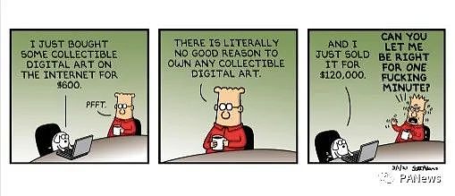 今年4月中旬,Scott Adams正在OpenSea上出售其著名漫畫的NFT版本,其中名為“Dilbert NFT Comic F-word”的NFT最高出價已達12萬美元。