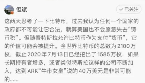 2月18日,中國投資界知名人士但斌在微博透露,他買了1%的比特幣ETF基金,并且說:雖然有點晚,但想通了就踐行!當然買的比較少,希望保持一下對新生事物的好奇心!