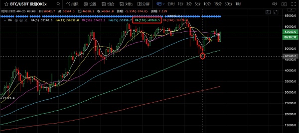 4月16日,據歐易OKEx行情數據顯示,BTC從63524美元附近開始下跌,在4月18日一度大跌至50900美元。據統計,4月18日12時,在1小時內合約市場全網總計爆倉39.6億美元,當日加密市場爆倉量超過2020年312與313之和。加密市場絕大多數幣種跟隨下跌,多頭慘遭血洗。之后數日,BTC繼續下跌,最低跌至46988美元,觸及MA120中期趨勢線,此次大回調累計跌幅約26%。