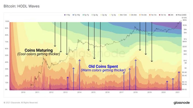 相反,當舊代幣被使用后,將被重新歸為新代幣(暖色),并相應增加新HODL波動曲線的厚度。通常,這些代幣只能在牛市后期使用,當新的波段的規模開始膨脹時,這可能表明宏觀情緒正在發生變化。