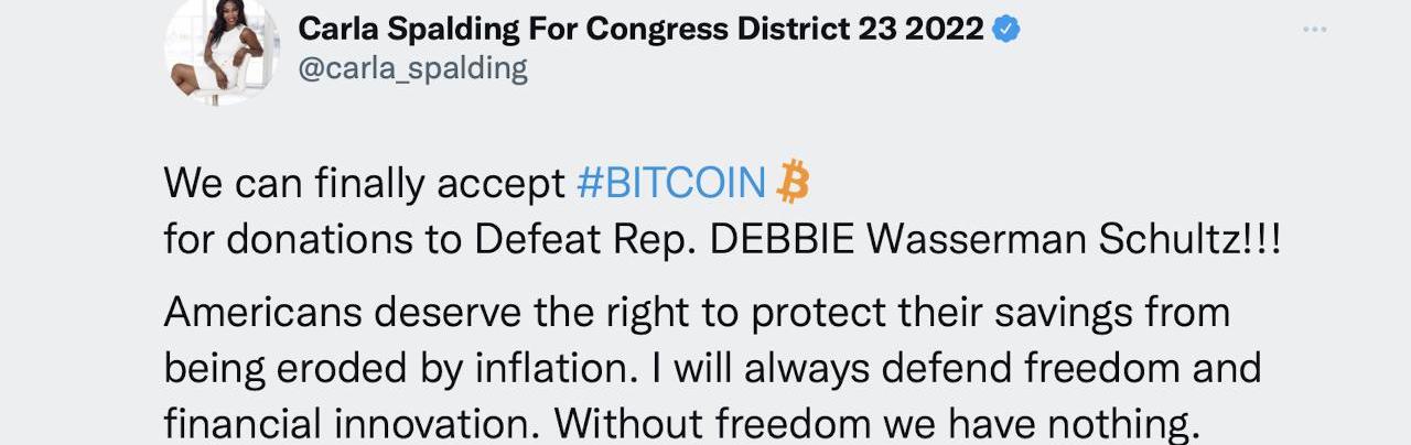 12月5日,美國國會第23區議員候選人CarlaSpalding發推宣布接受比特幣捐款,并稱“美國人應該有權保護他們的儲蓄不被通貨膨脹侵蝕。我將永遠捍衛自由和金融創新。沒有自由,我們就一無所有。”