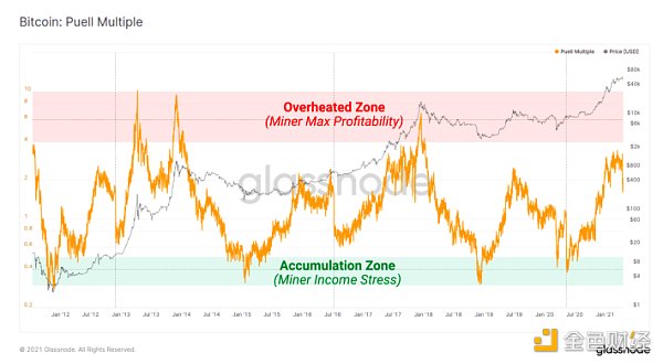 Puell Multiple?(普爾倍數)是一個建立此觀察的指標,Puell Multiple(普爾倍數)是當前礦工收入和其365天平均之間的比率。這將產生一個振蕩周期,來度量總的礦工獲利能力。