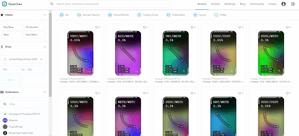此外,Uniswap V3還加入了LP的NFT化,其集中流動性,范圍訂單和彈性費用都被標記在NFT中。目前,Uniswap V3的NFT已經上線OpenSea。