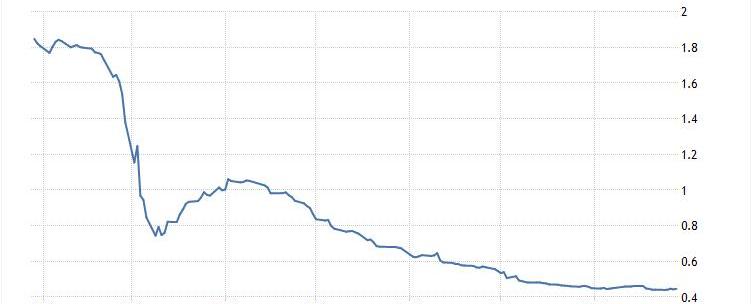 圖源:TradingEconomics上圖為2020年以美元為基準的LIBOR數據,我們可以看到在年初利率最高時只達到了年化1.8%左右,隨后下降到0.5%以下。