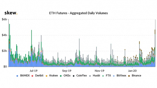三個大型交易所BitMEX,火幣和OKEx在周三各自成交了價值超過10億美元的以太期貨,占總交易量的近85%。