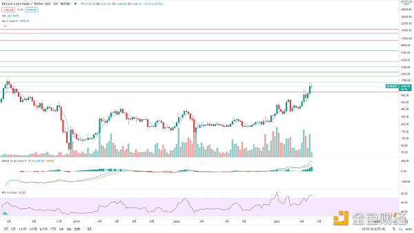 上方周線壓制1620美金有效突破,新的空間才會拉大,目前量能萎縮,短期突破概率不大,需進一步蓄勢,目前價格也偏離周均線較遠,日線不放量新高也是個背離,也有調整需求,短期支撐1200美金,趨勢支撐1000美金,回落可逢低布局,趨勢依舊多頭。